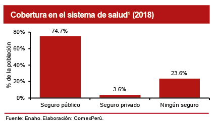 En primer lugar, tenemos que comprender que la salud es un derecho humano fundamental, por lo que resulta indispensable y relevante garantizar una provisión de calidad. Sin embargo, tal parece que muchas veces perdemos el foco acerca de dónde se encuentra el problema. Según cifras de la Encuesta Nacional de Hogares (Enaho) 2018, un 74.7% de la población accede a un seguro público (47.3% al SIS, 26.2% a EsSalud y 1.4% al seguro de las Fuerzas Armadas o Policiales), mientras que un 23.6% aún no cuenta con algún tipo de seguro y tan solo un 3.6% de la población cuenta con seguro privado (2% con seguro particular, 1.1% con EPS, 0.5% con seguro universitario y 0.2% con otros)[1].