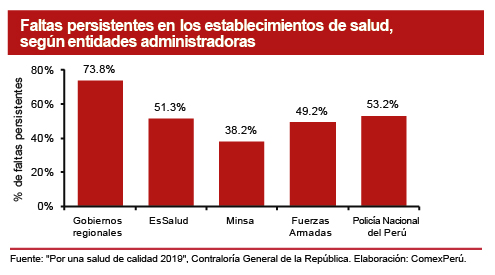 Los resultados del último reporte de la Contraloría General de la República, Por una salud de calidad 2019, publicado en agosto, no hacen más que demostrar que el ritmo de avance aún es bastante lento, pues el 65.6% de las observaciones realizadas en la visita de control 2018 persisten. En particular, casi en la mitad (45%) de los establecimientos de salud no se implementaron indicadores de gestión para mejorar los procesos, eficiencia y calidad de los servicios ofertados. Además, cabe precisar que existen deficiencias en la estructuración del gasto, pues se destinó solo un 1% del total al mantenimiento, lo cual da cuenta del limitado esfuerzo por garantizar instalaciones de calidad.
