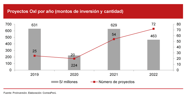 Si bien los efectos de estos ajustes no son inmediatos, lo cierto es que, en 2022, la cantidad de proyectos OxI creció hasta un total de 72, la más elevada luego de 2014, cuando hubo 76 proyectos. A nivel departamental, sobresalió el caso de Lambayeque, que consiguió por primera vez un proyecto OxI, relacionado con la mejora del servicio de agua potable y saneamiento en el centro poblado Palo Blanco, del distrito de Motupe. A su vez, Puno contó con un proyecto adjudicado luego de cinco años, correspondiente a seguridad ciudadana, por medio de la Municipalidad Distrital de San Miguel. Entre otros departamentos resaltantes, Cajamarca y Loreto fueron los que tuvieron la mayor cantidad de proyectos, 10 y 12, respectivamente, número que también fue el más alto jamás registrado por estos.