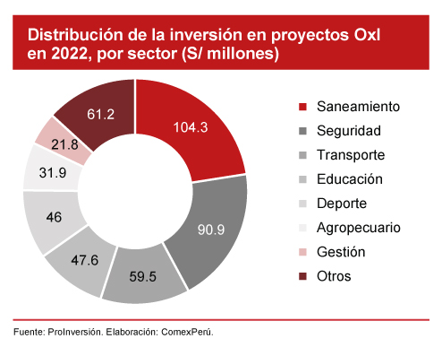 A nivel de sectores, saneamiento fue el que tuvo el mayor número de proyectos OxI en 2022, con 19 y un valor de inversión de S/ 104.3 millones. El sector seguridad, con 10 proyectos, fue el segundo con el mayor monto de inversión, S/ 90.9 millones; seguido por transporte, con S/ 59.5 millones, y educación, con S/ 47.6 millones.