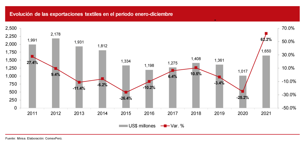 Las exportaciones del sector textil en 2021 mostraron un incremento del 62.2% con respecto al año previo. Cabe destacar que el valor exportado superó los niveles registrados antes de la pandemia, lo que demuestra que este resultado no responde únicamente al dinamismo del comercio mundial, como consecuencia de la recuperación económica, sino también al fortalecimiento del sector textil en el Perú. Según cifras de la Sunat, en el periodo enero-diciembre del año pasado, los envíos de este sector alcanzaron un valor de US$ 1,650 millones.