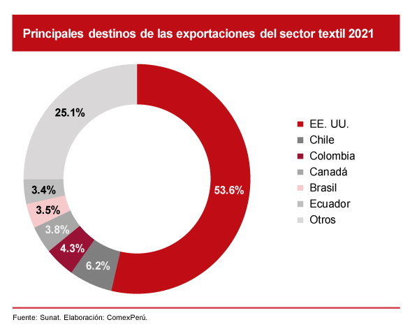Las compras del país norteamericano fueron de suma importancia para el sector textil, por lo que es clave mantener buenas relaciones comerciales con aquel. Esto con la finalidad de que las exportaciones en los próximos años por parte de dicho sector se mantengan en los niveles del 2021 o, incluso, aumenten después de haber experimentado caídas en los dos años previos. En cuanto a los destinos de exportación del sector textil, EE. UU. fue el principal, al concentrar el 53.6% de los envíos, valorizados en US$ 885 millones. Con respecto al 2020, EE. UU. incrementó sus compras un 63%.