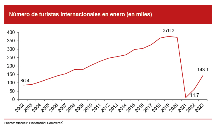 Al analizar la evolución del número de turistas internacionales que arribaron en enero, se observa que, si bien se ha tenido una recuperación luego de la pandemia (de 11,706 turistas en enero de 2021 a 143,058 en enero de 2023), este número está lejos de sus niveles prepandemia, ya que en enero de 2019 se registró el récord de turistas extranjeros que llegaron al país (376,263 turistas).