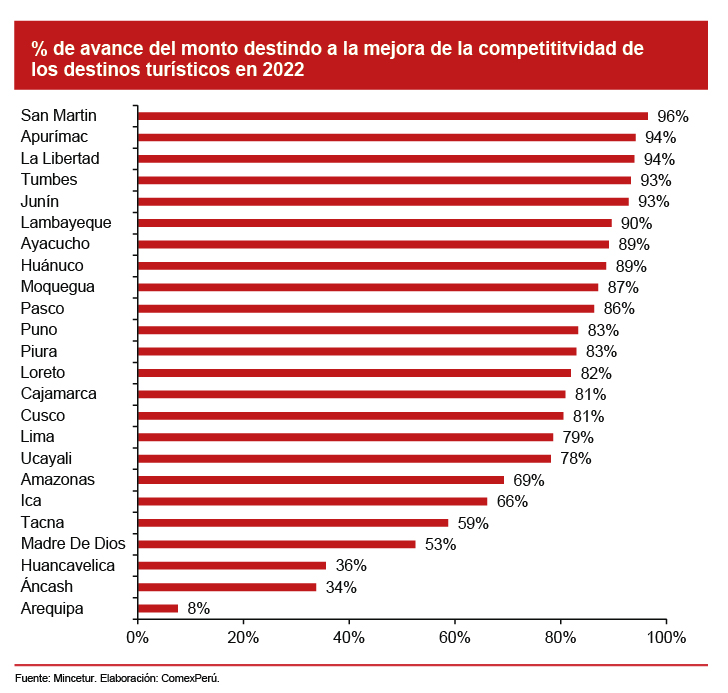 Otro aspecto interesante por analizar es la ejecución del monto destinado a la mejora de la competitividad de los destinos turísticos en 2022[1]. En el siguiente gráfico, podemos observar el desempeño de la ejecución del presupuesto público total destinado a esta función a nivel departamental. Si bien tenemos a la gran mayoría con altos números de gestión, también encontramos departamentos con cifras bajas de ejecución al cierre de 2022, como Arequipa, con un 8%, seguido por Áncash, con un 34%, y Huancavelica, con un 36%. Es necesario contemplar nuevos proyectos de inversión, así como tener hacedores de gestión capacitados para incrementar estos números, de manera que se impulse al sector turismo.