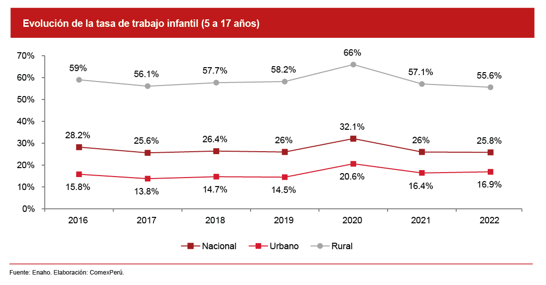De acuerdo con estimaciones de la Encuesta Nacional de Hogares (Enaho), durante el año pasado, el 25.8% de la población entre 5 y 17 años estuvo trabajando dentro o fuera del hogar[1], lo cual perjudicó a un total de 2.1 millones de menores de edad. La incidencia es considerablemente mayor en las zonas rurales (55.6%) en relación con lo reportado en las urbanas (16.9%). El motivo de esto radica en la participación de menores de edad en el sector agropecuario, pues, a nivel nacional, la mayoría de ellos reportó ayudar en la chacra o el pastoreo de animales.