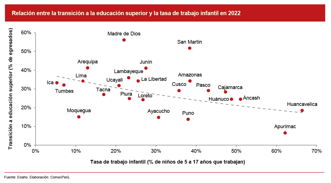Esta dinámica también se observa a nivel departamental, donde aquellos departamentos con una mayor tasa de trabajo infantil reportaron menores tasas de transición a la educación superior durante el año pasado. Los casos más problemáticos corresponden a Apurímac, que posee la menor tasa de transición a educación superior, con el 6.5%, y también reporta que el 62.1% de la población entre 5 y 17 años trabajó, seguido por Huancavelica, con la mayor tasa de empleo infantil (66.4%) y una de las más bajas en transición a la educación superior (18.5%).