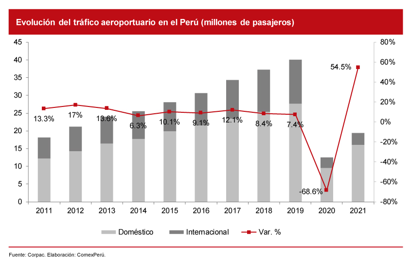 Los datos más recientes de la Corporación Peruana de Aeropuertos y Aviación Comercial (Corpac) muestran que, en 2021, el movimiento general de pasajeros en los aeropuertos del Perú fue un 54.5% más que en 2020, aunque un 51.5% menos que lo registrado en 2019.