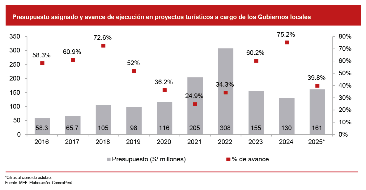 De acuerdo con cifras del Ministerio de Economía y Finanzas (MEF), los municipios a nivel nacional tienen un presupuesto conjunto de S/ 161 millones para obras turísticas en este año. De dicho total, al cierre de octubre, se ejecutaron S/ 64.3 millones, lo que significa un avance del 39.8%. Este desempeño ubica al turismo como la segunda función con menor avance de inversión en obras y solo supera a la función industria (37.6% de avance). Para tener una referencia, las funciones que ocupan los primeros lugares en avance de ejecución del presupuesto para inversión en obras turísticas a cargo de los Gobiernos locales, son orden público y seguridad, con un 66.2% de avance, comunicaciones (62.4%), trabajo (60.1%) y minería (60%).