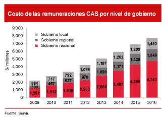 En efecto, la cantidad de trabajadores contratados bajo el régimen CAS ha venido creciendo de manera sostenida en los últimos años. De esta forma, entre 2009 y 2016, pasaron de 156,573 a 257,140, es decir, el número de servidores civiles bajo régimen CAS aumentó a una tasa anual promedio del 8.4%, o un crecimiento acumulado del 76%, según la Autoridad Nacional del Servicio Nacional Civil (Servir). En el último año, estos representaban el 22% de los trabajadores del Estado, o un 40% si no se toma en cuenta a los servidores de las carreras públicas[3], lo que se condice con un aumento en el costo de la planilla pública, y que, de acuerdo con información del Ministerio de Economía y Finanzas, creció un 88.6% en el mismo periodo. Asimismo, según cifras de Servir, el costo de la planilla CAS aumentó un 249% entre 2009 y 2016, y en ese último año ya representaba un 17.2% de la planilla del Estado y un 1.2% del PBI nominal.