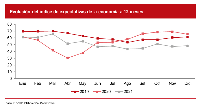 El efecto de la inestabilidad política sobre las inversiones se aprecia mejor en los resultados del índice de expectativas de la economía a 12 meses, el cual comenzó a deteriorarse desde abril de 2021, mes en el cual concluyó la primera vuelta de las últimas elecciones generales. Desde junio del año pasado, las expectativas se encuentran en terreno negativo, con la única excepción de octubre, cuando alcanzaron el valor de 50.97 (se consideran positivas a partir de 50).
