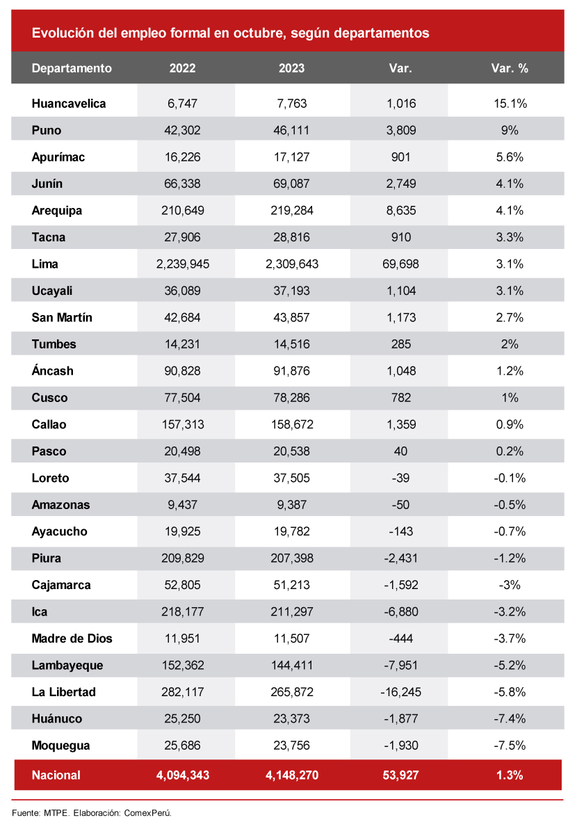 Sin embargo, también debe tenerse presente que, entre los departamentos que reportaron resultados positivos en la creación de empleo formal en octubre, 10 de ellos mantienen un menor dinamismo durante los últimos meses en relación con los resultados de la primera mitad del año pasado. Es decir, se está perdiendo la capacidad de generar empleos formales, debido al menor crecimiento y la falta de incentivos necesarios para la contratación, lo cual no debería suceder en un país que todavía enfrenta una de las mayores tasas de informalidad laboral.