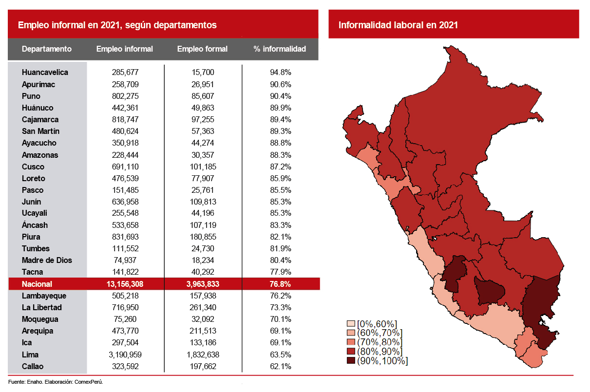 De acuerdo con el último reporte del Desempeño del mercado laboral peruano al 2021, elaborado por ComexPerú, la cantidad de trabajadores informales a nivel nacional aumentó a 13,156,308, lo que significa un incremento del 17.2% con respecto a 2020. No obstante, debido a una menor expansión de los empleos formales a nivel nacional (+7.9%), esto llevó a un incremento significativo en la tasa de informalidad laboral al 76.8%, lo cual supera inclusive los resultados de 2017 (72.6%).
