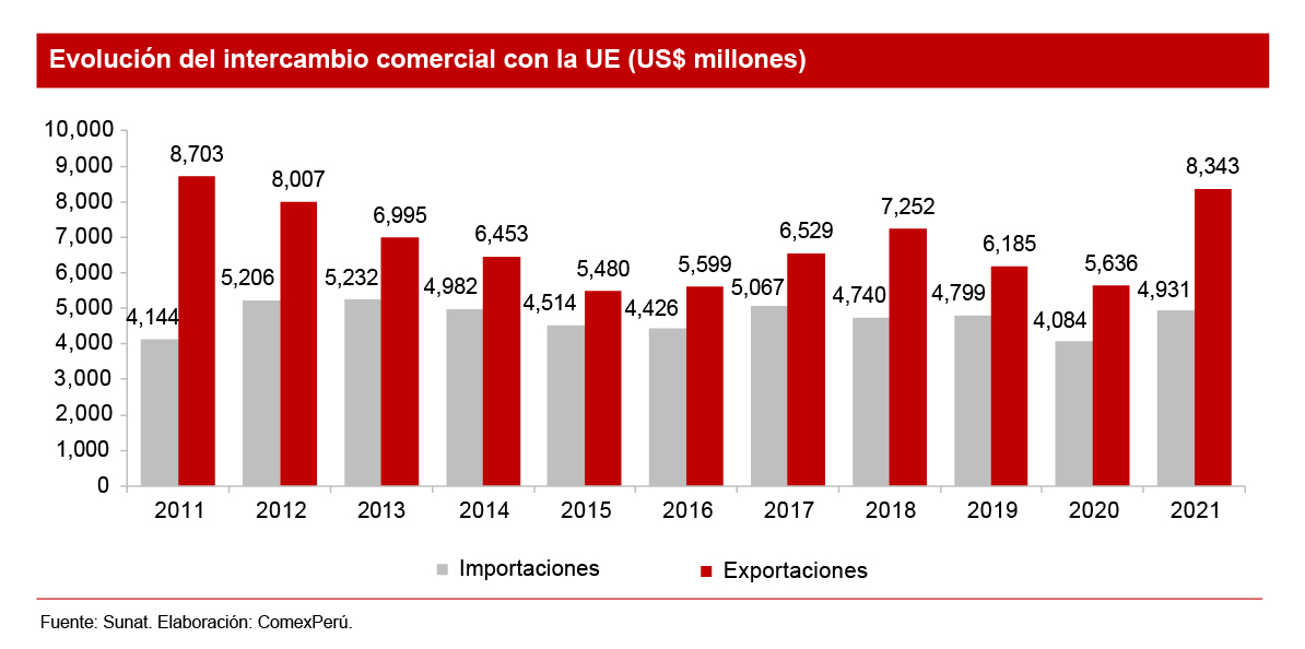 En marzo de 2022, se cumplieron nueve años del acuerdo comercial entre el Perú y la Unión Europea (UE). Las cifras de 2021 muestran que nuestras exportaciones a este bloque se recuperaron luego de lo que significó el año 2020, al sumar US$ 8,343 millones (+48%), según la Sunat. En cuanto a las importaciones, estas tuvieron un valor de US$ 4,931 millones en 2021 (+20.7%).