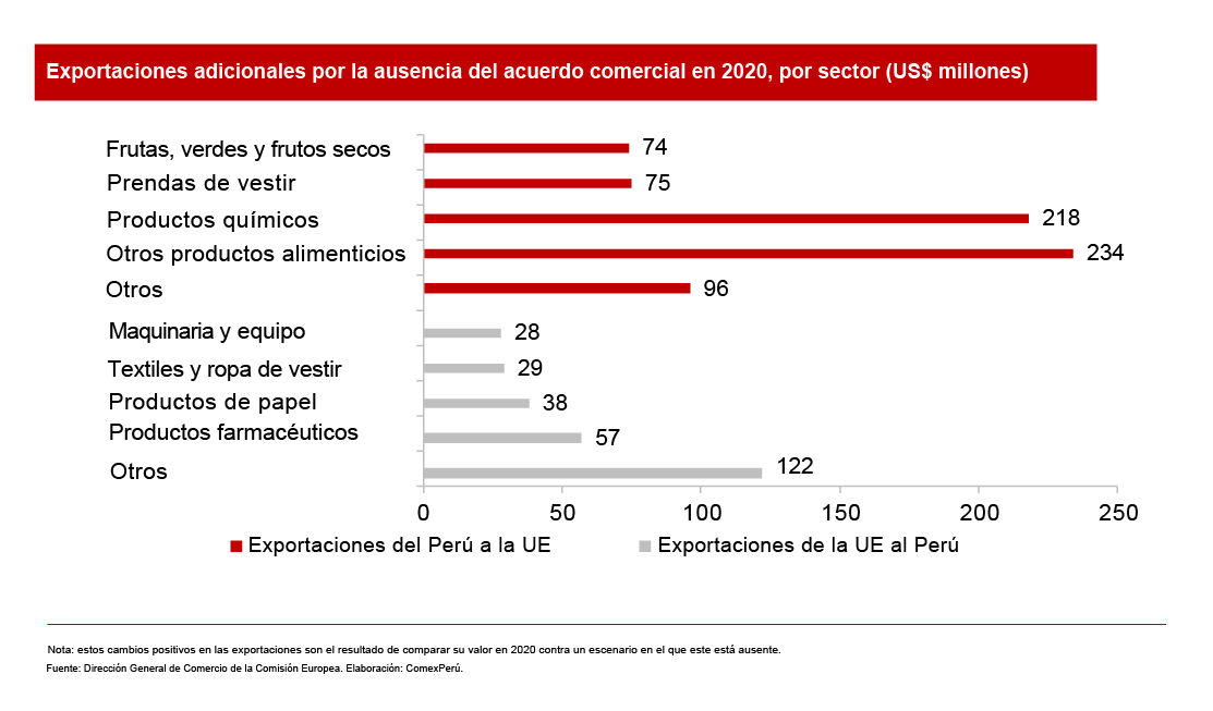 A nivel de sectores, las exportaciones de la UE al Perú más beneficiadas fueron las de productos farmacéuticos, productos de papel, textiles y prendas de vestir, y maquinaria. En el caso de las exportaciones del Perú a la UE, los sectores más beneficiados fueron los de otros productos alimenticios (fuera de los tradicionales), productos químicos, prendas de vestir, y frutas y verduras.