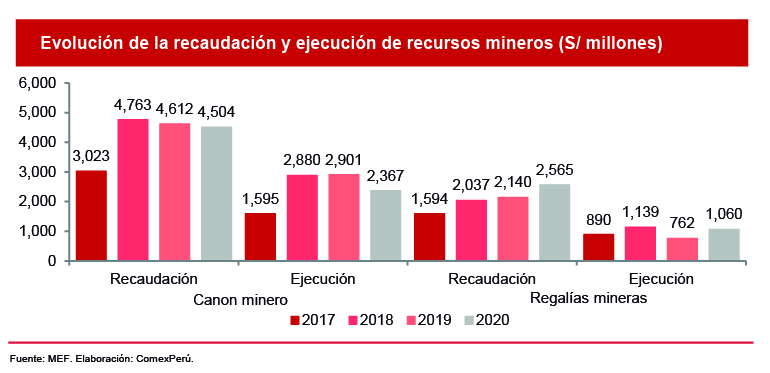 El sector minero es uno de los más importantes para el país, lo cual se aprecia en su invariable, pero considerable, participación en la producción nacional, pues la minería metálica pasó de representar el 8.9% al 8.8% del PBI entre 2010 y 2020. Además, el año pasado aportó considerables recursos al Gobierno, pues la recaudación de canon minero ascendió a S/ 4,504 millones y las regalías mineras alcanzaron los S/ 2,565 millones, lo que representó un 4.3% y un 2.5% del total recaudado en el periodo, respectivamente, según el Ministerio de Economía y Finanzas (MEF)[1]. Lamentablemente, al igual que en los últimos años, la ejecución de estos recursos se situó muy por debajo de lo disponible, con apenas S/ 2,367 millones y S/ 1,060 millones ejecutados provenientes del canon y las regalías en 2020, lo que significó apenas el 52.6% y el 41.4% del monto recaudado, respectivamente.