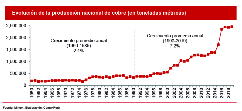 En contraste, durante la década de los setenta y ochenta, el Gobierno fue el principal actor en la explotación de los recursos mineros a través de empresas estatales como Minero Perú, Centromín y Hierro Perú, pero, aun así, el principal productor de cobre fue una empresa privada de capitales extranjeros. Ello explicó el aumento de la producción, que entre 1960 y 1989 creció de 183,988 a 368,168 toneladas métricas, a razón del 2.4% promedio por año, pero tras las reformas pasó de 323,412 a 2,455,440 toneladas métricas entre 1990 y 2019, a razón del 7.2% anual, según el Minem.