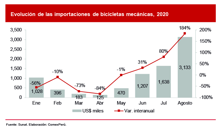 De acuerdo con información de la Sunat, entre enero y agosto de 2020, se importaron bicicletas mecánicas por un monto total de US$ 8.2 millones, un 7.2% por encima del año previo. Este resultado respondería a la creciente importación en los meses de junio, julio y agosto, cuando la variación interanual fue del +31%, +80% y +184%, respectivamente. Estas cifras resultan especialmente curiosas si se considera que el comportamiento de las importaciones del producto durante estos meses del año suele ser bajo. En particular, el mes de agosto ha presentado su mejor comportamiento en los últimos 10 años y se equipara con octubre y noviembre, meses de altos volúmenes de importación de bicicletas mecánicas, asociados con la campaña navideña.