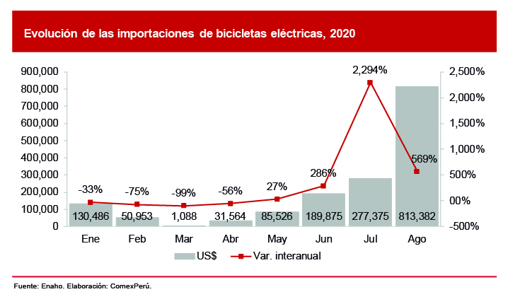 Si bien las bicicletas mecánicas han sido una primera elección, otras alternativas al transporte masivo, más modernas, también han presentado comportamientos crecientes. Así, por ejemplo, entre enero y agosto de 2020, se importaron bicicletas, scooters y moto scooters eléctricos por un monto total de US$ 3.5 millones, equivalente a 14,780 unidades. Las bicicletas eléctricas han mostrado crecimientos interanuales exorbitantes, especialmente en los meses de julio (+2,294%) y agosto (+569%). Solo entre esos meses se importó 4,901 unidades, que representan el 86% del total de lo importado en lo que va del año.