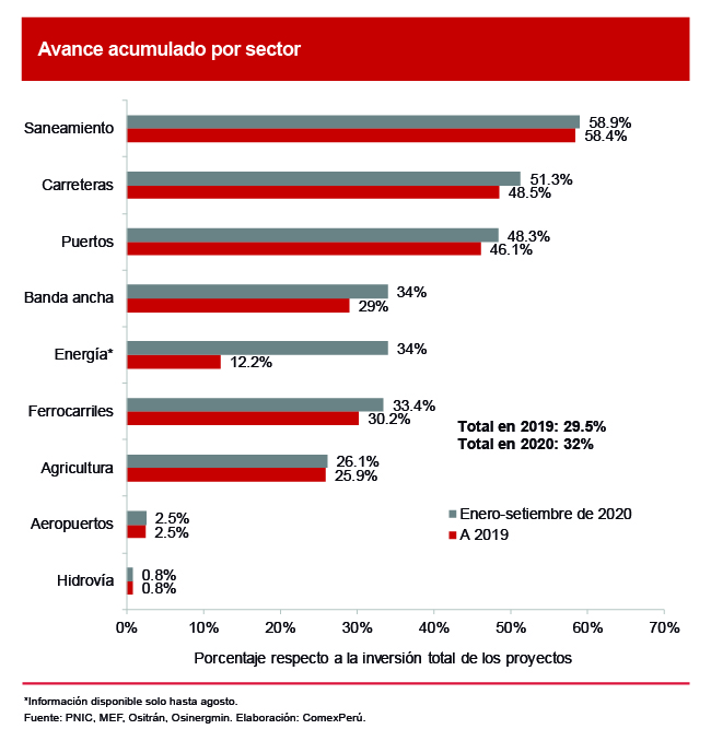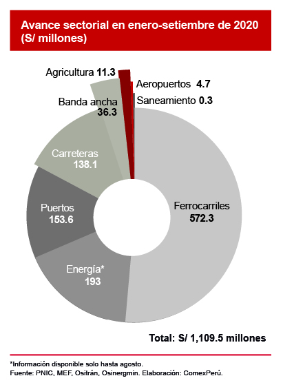 En el periodo enero-setiembre de 2020, la ejecución de los proyectos en el marco del PNIC fue igual a S/1,109.5 millones, de los cuales S/ 572.3 millones correspondieron a la Línea 2 y Ramal del Metro de Lima y Callao, proyecto del sector ferrocarriles y, por mucho, el de mayor inversión en el PNIC. Le siguieron los sectores energía (S/ 193 millones), puertos (S/ 153.6 millones) y carreteras (S/ 138.1 millones), mientras que el resto de los sectores (banda ancha, aeropuertos, agricultura y saneamiento) tuvo montos pequeños de avance (S/ 52.6 millones).