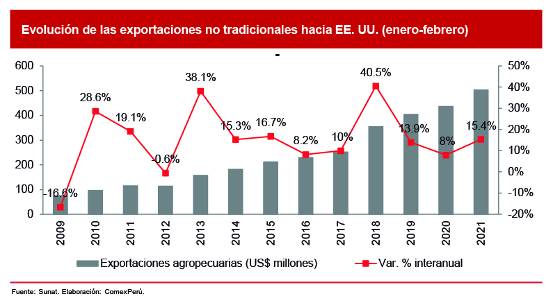 Respecto del resultado en toneladas de las exportaciones agropecuarias no tradicionales en el primer bimestre, se registraron envíos por 757,384 toneladas, lo que significaría un aumento del 4.7% con relación a enero y febrero de 2020. Por su parte, el aumento en el valor de las exportaciones reportado sería atribuido a los precios, lo que va de la mano con lo que reporta el FMI.