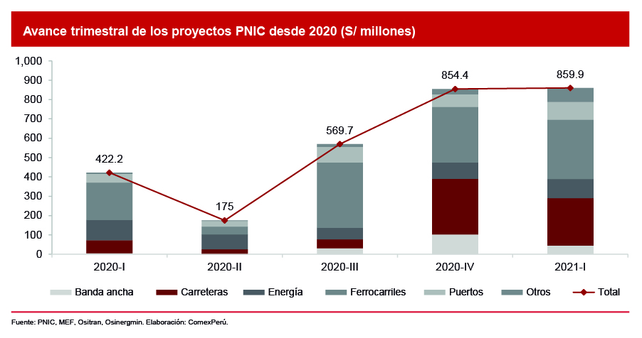 En el primer trimestre de 2021, los 32 proyectos en cuestión ejecutaron S/ 859.9 millones. El sector ferrocarriles, representado por la Línea 2 del Metro de Lima y el Callao, tuvo la mayor ejecución, S/ 307.8 millones; a este le siguieron el sector carreteras, con S/ 245.1 millones; energía, con S/ 98.8 millones; puertos, con S/ 90.8 millones; y aeropuertos, con S/ 50.3 millones. El resto de los sectores (banda ancha, saneamiento y agricultura) tuvo montos pequeños de avance, los cuales sumaron S/ 50.3 millones.