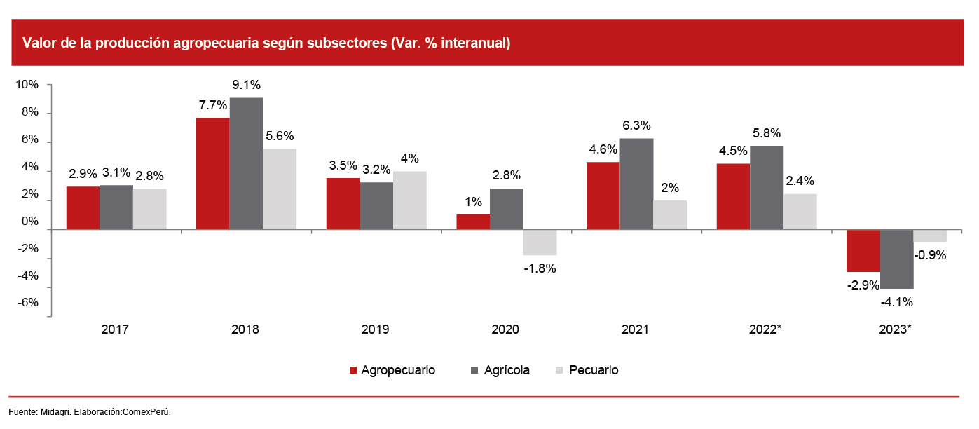 En setiembre del año pasado, el presidente del Banco Central de Reserva del Perú (BCRP), Julio Velarde, manifestó que 2023 sería el peor de los últimos 26 años para el sector agropecuario. De acuerdo con cifras del Ministerio de Desarrollo Agrario y Riesgo (Midagri), dicho sector sufrió una caída del 2.9% en comparación con 2022, lo cual se debió a la contracción del 0.9% en el sector pecuario y el 4.1% en la producción agrícola.