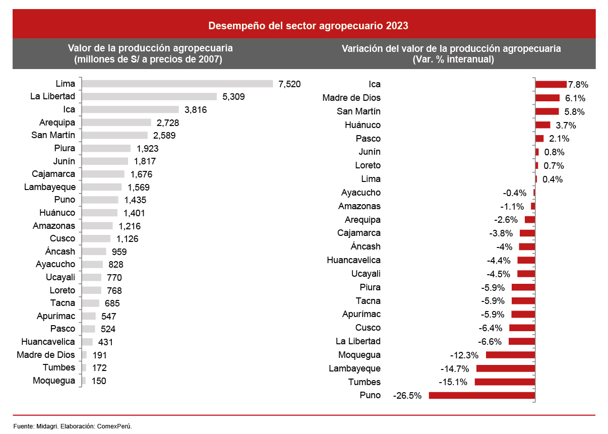 A nivel departamental, Lima encabezó el ranking del valor de la producción agropecuaria en 2023, al registrar S/ 7,520 millones, lo cual es un aumento del 0.4% en comparación con 2022. Luego se ubicó La Libertad, con S/ 5,309 millones (-6.6%), seguido por Ica (S/ 3,816 millones, +7.8%), Arequipa (S/ 2,728 millones; -2,6%), San Martín (S/ 2,589 millones; +5.8%) y Piura (S/ 1,923 millones; -5.9%).