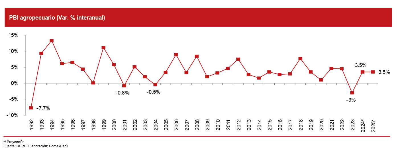 ¿Qué le espera al sector agropecuario en 2024? Según el BCRP, se estima que su PBI se recupere y crezca un 3.5%, y que esta tasa se mantenga durante 2025. Cabe señalar que dicha cifra se encuentra 0.5 puntos porcentuales (pp.) por debajo del promedio de los últimos 32 años, y que la proyección se basa en un escenario de un fenómeno de El Niño costero débil.