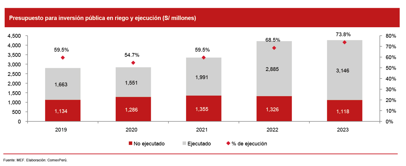 Esta falta de ejecución es muy preocupante, debido a que compromete la resiliencia del sector agrícola frente a los desafíos climáticos. Los proyectos de infraestructura de riego, especialmente los de riego tecnificado, aumentan la eficiencia en el uso del agua, lo que permite un mejor manejo de los cultivos y una mayor productividad. Esto conlleva a una mayor producción gracias a más hectáreas cultivadas y de mejor calidad, lo cual nos permitiría compensar mucho mejor la escasez y pérdidas de productos cuando se producen los estragos climáticos.