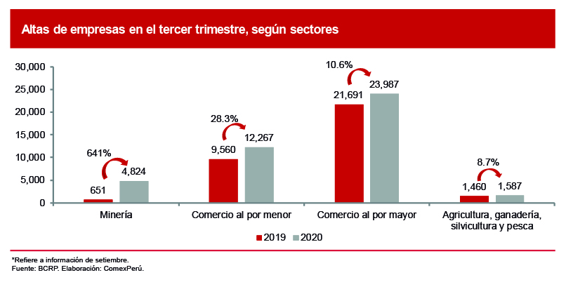 Este desempeño se explicó por la cantidad de empresas mineras que en el tercer trimestre comenzaron a operar o reanudaron sus actividades, pues se registraron 4,824, lo cual representó un incremento del 641% respecto de lo registrado en el mismo periodo de 2019, aunque ello estuvo influenciado por la estructura del proceso de reactivación económica, pues recién en la tercera fase se contemplaron todas las actividades del sector y, además, este no podía reactivarse de inmediato[1]. Por su parte, el comercio al por menor también registró un crecimiento considerable, con 12,267 (+28.3%) ingresantes y, al por mayor, con las 23,987 (+10.6%), que se vincularía al proceso de recuperación de la demanda interna. Asimismo, los pronósticos favorables del sector agropecuario y pesquero, los cuales serían los únicos que crecerían en 2020, según el BCRP, habrían favorecido la expansión de las empresas destinadas a estas actividades y a la silvicultura en 1,587 (+8.7%).