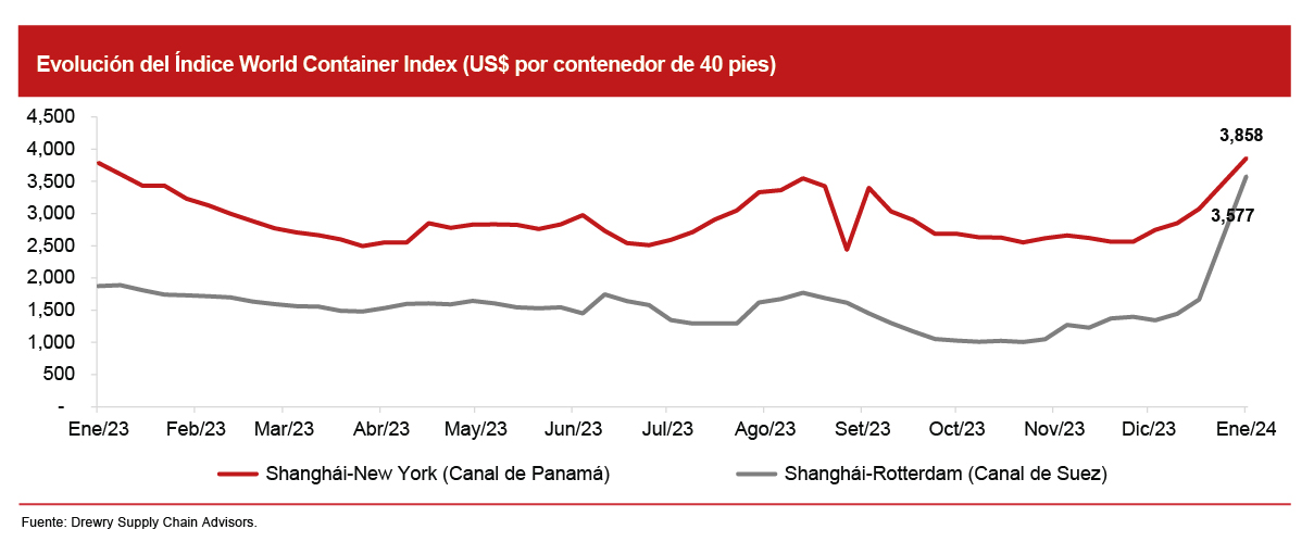 Como consecuencia de estos ataques, desde el 16 de diciembre pasado, las principales líneas navieras, como Maersk, Hapag-Lloyd, ONE y MSC, han anunciado la suspensión de las travesías de sus buques portacontenedores en el mar Rojo. En su lugar, han optado por redirigir sus rutas hacia el cabo de Buena Esperanza, ubicado en Sudáfrica, lo que genera un aumento en el tiempo de transporte de entre 10 y 20 días. Asimismo, el precio de los fletes marítimos ha experimentado una presión al alza, especialmente en las rutas desde Asia hacia el norte de Europa, superando los US$ 4,000, lo que representa un aumento superior al 170% desde el inicio de los desvíos en la segunda quincena de diciembre de 2023, según Freightos, consultora especializada en transporte marítimo.
