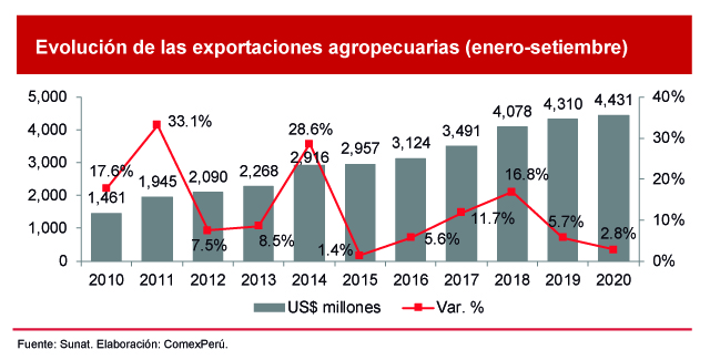 Las exportaciones del sector agropecuario han experimentado un crecimiento positivo ininterrumpido durante el periodo enero-setiembre desde 2010. La fortaleza del sector ha permitido que, a pesar de seguir enfrentando las consecuencias de la pandemia, sea el único en aumentar su valor de exportaciones durante el período de análisis, con la importante cifra de US$ 4,431 millones, un 2.8% más respecto del mismo periodo de 2019. A pesar de que es la tasa de crecimiento más baja desde 2015, se espera que el año cierre con un crecimiento de exportaciones del sector entre el 3% y el 4%.