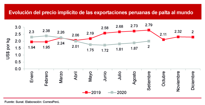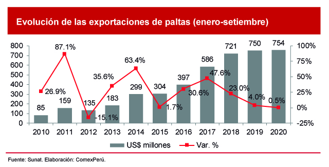 Durante el período enero-setiembre de 2020, las exportaciones de palta, producto líder del sector, alcanzaron un valor de US$ 754 millones y crecieron un 0.5% respecto de 2019. Destacaron nuestros envíos a economías de Europa como Países Bajos (US$ 251 millones, +1%), España (US$ 164 millones, +12.7%), Reino Unido (US$ 62 millones, +5.1%) y Rusia (US$ 19 millones, +198%). De igual manera, se realizaron importantes envíos a países del continente asiático, como China (US$ 25 millones, -1.2%) y Japón (US$ 21 millones, +66.6%).
