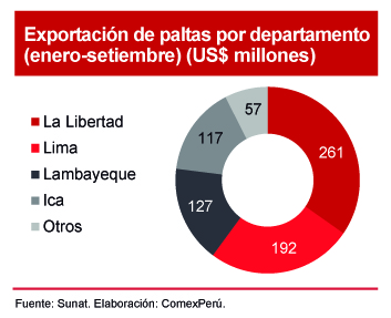 Por otro lado, de acuerdo con cifras de la Sunat, los principales departamentos que generaron un mayor valor de exportación de palta durante el período analizado fueron La Libertad, Lima, Lambayeque e Ica, que concentraron un 34.7%, 25.5%, 16.8% y 15.5% del total exportado, respectivamente. La Libertad exportó un volumen total de 142,405 toneladas (t), un 51.6% más que en 2019; con lo que el valor de exportación de paltas en este departamento fue de US$ 261 millones durante el período de enero-setiembre de 2020, un 10.5% más que en 2019. El 63.3% del valor total de las exportaciones de La Libertad corresponde a la provincia de Virú, mientras que un 30.5% provino de Chepén. Le siguió Lima, que exportó 100,774 t, un 12.4% más que en 2019, con un valor de exportación de US$ 192 millones, un 9.9% menos que en 2019. Del total de exportación de Lima, el 51.5% proviene de la provincia de Huaral, mientras que un 17.9% corresponde a Barranca.