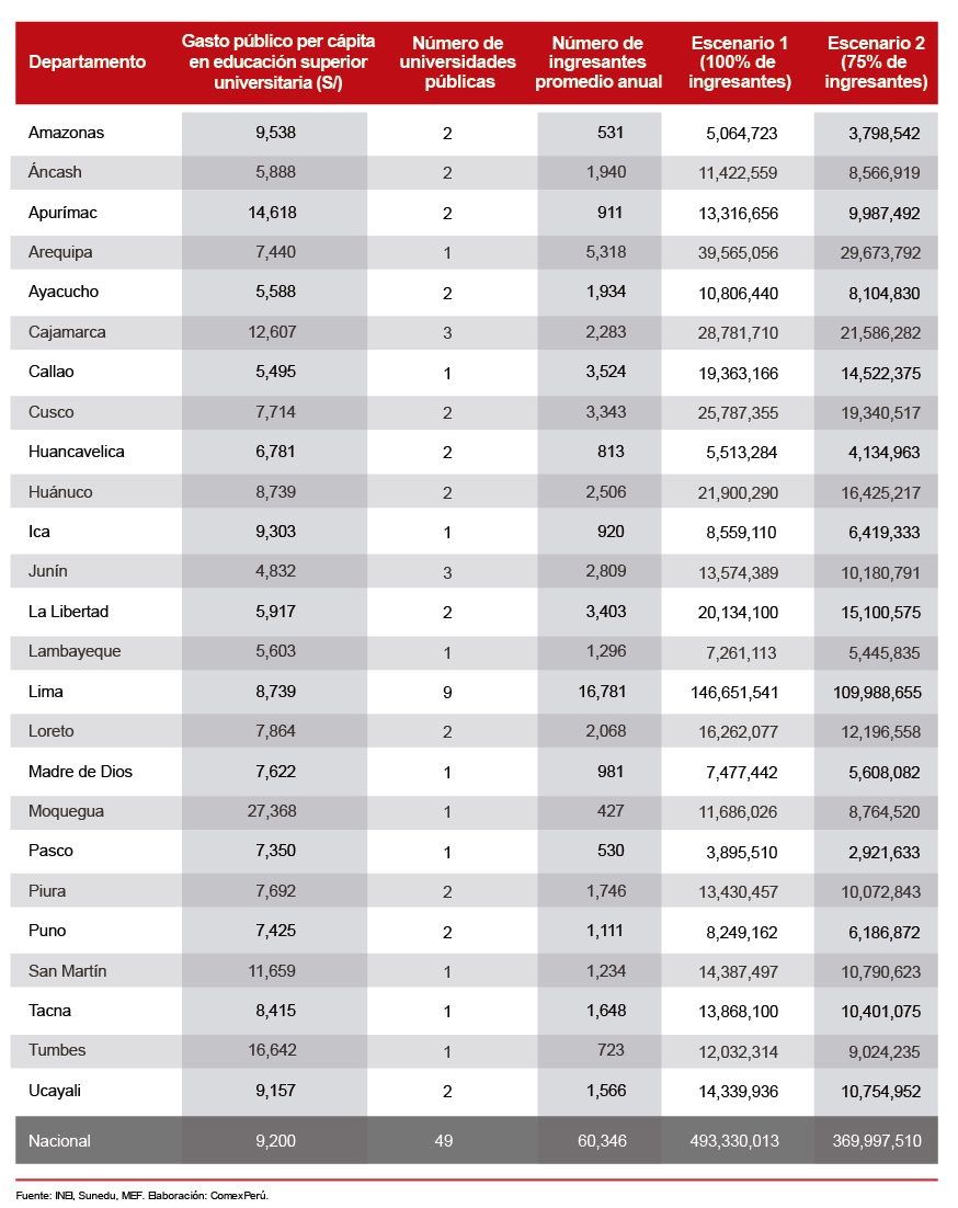 Por otro lado, es necesario saber cuánto le costaría al Gobierno implementar una medida así. Según cifras del Instituto Nacional de Estadística e Informática (INEI), el gasto público promedio per cápita en la educación superior universitaria a nivel nacional es de S/ 9,200, y los departamentos con mayor gasto per cápita son Moquegua (S/ 27,638), Tumbes (S/ 16,642), Apurímac (S/ 14,618) y Cajamarca (S/ 12,607). Al respecto, a modo de análisis, se presentan dos escenarios sobre cuánto se incrementaría el gasto público en educación superior, con base en el gasto per cápita y el número promedio de ingresantes a universidades públicas por departamento.