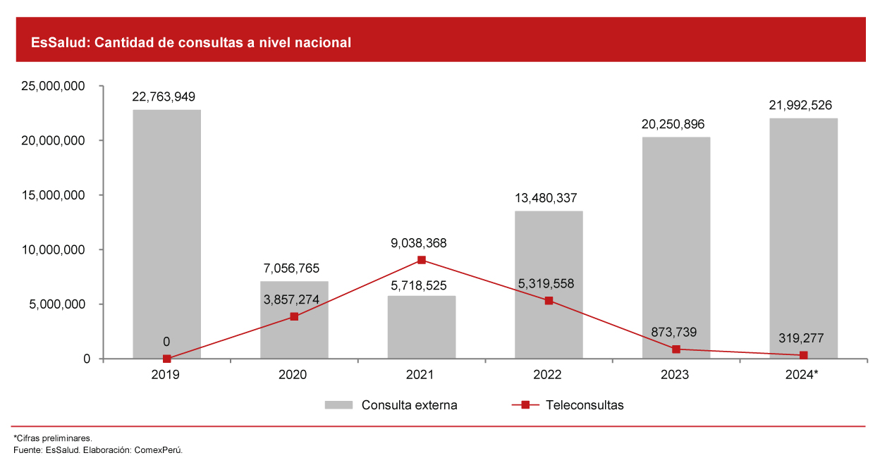 Durante la pandemia, una respuesta lógica fue implementar la telemedicina, debido a las dificultades para atenciones presenciales y la saturación de los establecimientos de salud. Así, las teleconsultas facilitaron el seguimiento a pacientes crónicos, la renovación de recetas, las atenciones en medicina general y en hasta 24 especialidades médicas. Sin embargo, el servicio perdió relevancia, ya que de nueve millones de consultas en 2021 se redujo a apenas 320,000 en 2024. A setiembre de 2025, apenas se registraron 150,636 teleconsultas, lo que advierte el riesgo de desaparición del sistema.