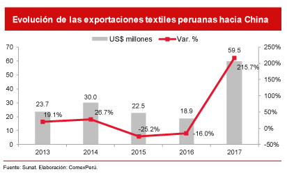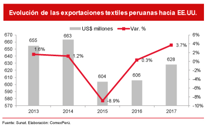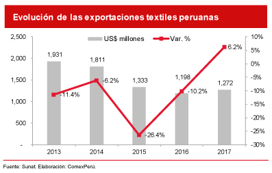Tras acumular 4 años consecutivos de caídas, especialmente en 2015 (-26.4%), y registrar el valor más bajo en 2016 (US$ 1,198 millones), las exportaciones de productos textiles lograron una variación positiva en 2017, al sumar un valor de US$ 1,272 millones, un 6.2% más que el año anterior. Dicho resultado contribuyó al crecimiento de las exportaciones no tradicionales (+7.9%), que alcanzaron un valor de US$ 11,693 millones. Estas últimas, también, lograron revertir su caída en comparación con el año anterior y, a su vez, contribuyeron al dinamismo de las exportaciones totales de 2017 (+21.5%).