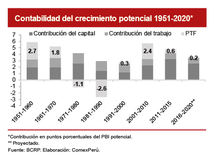 Por último, tal como se observa en el gráfico, en la década de los setenta y ochenta, la productividad total de factores (PTF) sufrió un evidente deterioro. Según el BCRP, las políticas intervencionistas y proteccionistas contribuyeron a dicho resultado. En esta línea, fueron las reformas estructurales implementadas en los noventa, para promover la economía de mercado, las que contribuyeron a la mejora de la PTF. En lo que concierne a los periodos más recientes, la misma institución señala que la regulación excesiva obstaculiza un mayor dinamismo de la PTF. Dadas estas condiciones, resulta paradójico que haya quienes busquen aún una mayor intervención estatal.