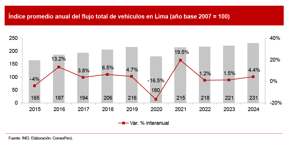 El índice de flujo vehicular promedio anual en Lima aumentó un 4.4% en 2024. Impulsar proyectos de infraestructura vial será importante para reducir la congestión vehicular. Sin embargo, la solución integral debe incluir una conexión eficiente con el sistema de transporte público masivo, lo que permitiría reducir los costos asociados al tráfico.