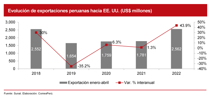 Al analizar el desempeño del comercio entre ambos países en lo que va del presente año, nuestras exportaciones hacia EE. UU. sumaron un total de US$ 2,562 millones entre enero y abril de 2022, un 43.9% más que en el mismo periodo de 2021. De dicho monto, el sector no tradicional representó el 64.9% (US$ 1,663 millones), mientras que el restante 35.1% correspondió a nuestros envíos tradicionales (US$ 899 millones). Cabe resaltar que EE. UU. se posicionó como el principal destino de nuestras exportaciones no tradicionales en el periodo de análisis, seguido por Países Bajos (US$ 453 millones).