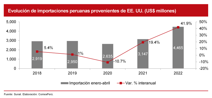 En lo que respecta a nuestras importaciones provenientes de EE. UU., entre enero y abril de 2022, estas sumaron un valor total de US$ 4,465 millones, un 41.9% más que lo registrado en similar periodo del año previo. Además, dicho resultado ubica a dicho país como nuestro segundo principal país de origen de importaciones, pues representa el 23% del total demandado del mundo en el periodo de análisis.