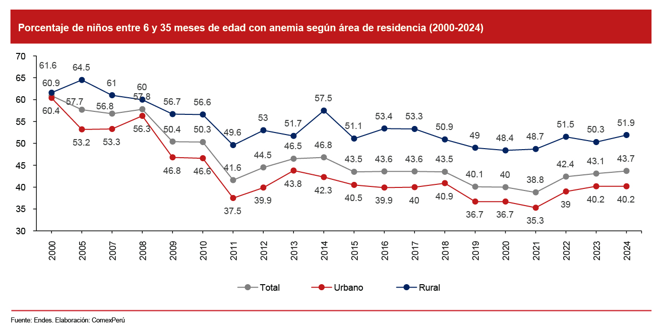 La mayoría del progreso se concentró entre 2000 y 2011, cuando disminuyó del 69.9% al 41.6%. Sin embargo, este avance se estancó desde entonces y se mantuvo alrededor del 40%. Para el Colegio Médico del Perú (CMP), el avance respondió a la caída de la pobreza monetaria y la mayor seguridad alimentaria del país durante el periodo; mientras que el estancamiento se debió al menor crecimiento económico de los años posteriores. Una prevalencia mayor al 40% es considerada por la Organización Mundial de la Salud (OMS) como un problema de salud pública severo.