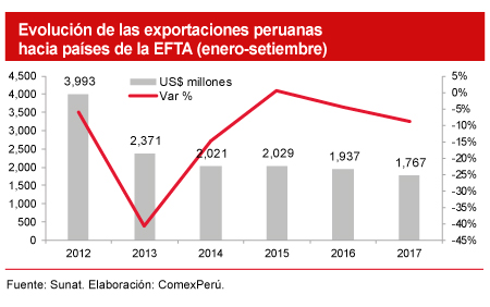 Desde que, en julio de 2012, entró en vigencia el acuerdo comercial con la Asociación Europea de Libre Comercio (EFTA, por sus siglas en inglés), conformada por Suiza, Liechtenstein, Noruega e Islandia, nuestras exportaciones hacia este bloque, en promedio, han representado un 9% del total. Estos mercados albergan una población de 13.9 millones de personas y, a fines de 2016, nuestras exportaciones hacia este destino totalizaron US$ 2,602 millones, de los cuales US$ 2,571 millones fueron envíos a Suiza, US$ 29.5 millones a Noruega y US$ 890,000 a Islandia. Así, queda claro que Suiza es el principal mercado de nuestros envíos hacia la EFTA. Entre los principales productos que le exportamos se encuentran el oro, los minerales de cobre, el aceite de pescado, los espárragos, las paltas y los textiles.