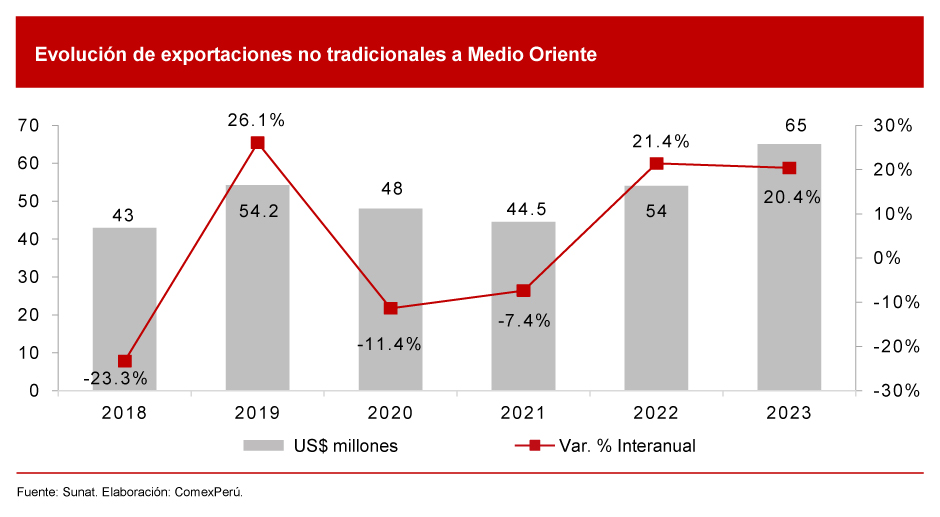 Al cierre de 2023, los envíos no tradicionales a Medio Oriente registraron un aumento del 20.4% (US$ 65 millones en 2023). Las exportaciones agropecuarias impulsaron el dinamismo del rubro al sumar US$ 37 millones, un crecimiento del 13.3%.