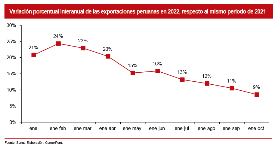 Si bien las exportaciones totales aún muestran un dinamismo importante, este es cada vez menor, debido a los menores envíos mineros, especialmente de cobre, ya que es un metal que representa el 27% del total de nuestras exportaciones al mundo. Por ejemplo, en los periodos enero-febrero y enero-marzo de 2022, las exportaciones peruanas crecieron un 24% y un 23%, respectivamente, con respecto a similar periodo en el año previo. Esto debido a que la cotización del cobre estaba en aumento.