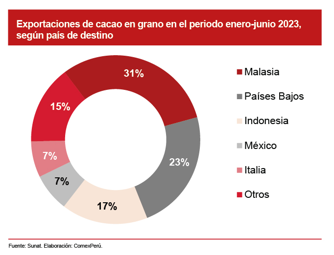 En lo concerniente a los países de destino, en el periodo enero-junio de 2023, Malasia lideró el ranking, ya que representó el 31% del total exportado. Las exportaciones a dicho destino ascendieron a US$ 22.9 millones, lo que significó un crecimiento del 882%. Además, el volumen exportado sumó 8,878 toneladas, un 787% más que en los primeros seis meses de 2022. Es preciso destacar que, en este primer semestre de 2023, las exportaciones a Malasia superaron todo lo exportado durante el año 2022 (US$ 15.5 millones y 6,690 toneladas). De igual forma, cabe mencionar que ese país se encuentra entre los cinco principales importadores mundiales de cacao en grano. Según el Centro de Comercio Internacional (ITC por sus siglas en inglés), Malasia importó US$ 1,070 millones y 459,400 toneladas de este producto durante 2022.