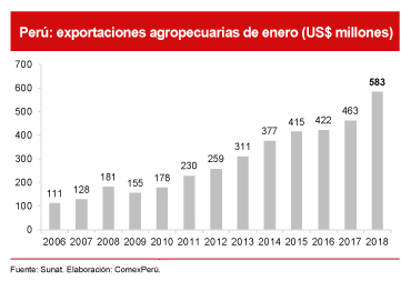 Exceptuando los dos primeros —que este año se benefician de un contexto económico favorable a nivel global, por el mayor precio de los commodities y la mejor situación de los principales países que los demandan—, el agro no tradicional vuelve a llamar la atención para recordarnos que viene pisando fuerte. Con 10 años consecutivos de crecimiento ininterrumpido, las exportaciones del sector agropecuario alcanzaron, en enero de 2018, un valor de US$ 583 millones, casi cuatro veces el registrado en el mismo mes de 2009. Esto significó también un crecimiento acumulado del 276% en la última década.