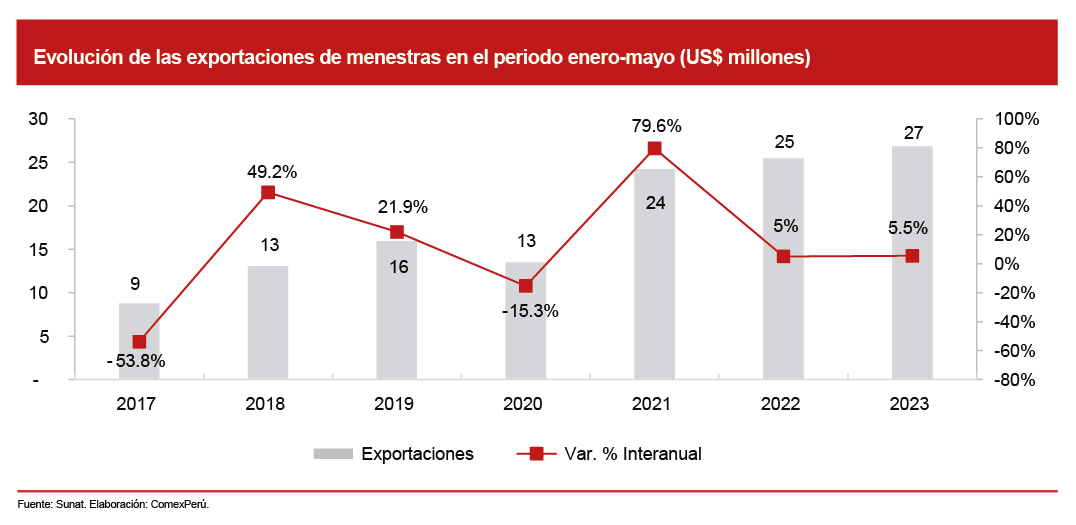 Según las cifras de la Sunat, en este periodo, las exportaciones de menestras sumaron US$ 26.8 millones, con un incremento del 5.5% con respecto al mismo periodo del año pasado. Además, entre enero y mayo de 2022, presentaron un crecimiento similar (+5%) con respecto al mismo periodo de 2021. Ahora bien, en lo que respecta al volumen exportado, en el periodo de análisis se exportaron 14,817 toneladas, 2,834 toneladas menos, lo que representó una caída del 16.1% en comparación con el mismo periodo del año anterior.