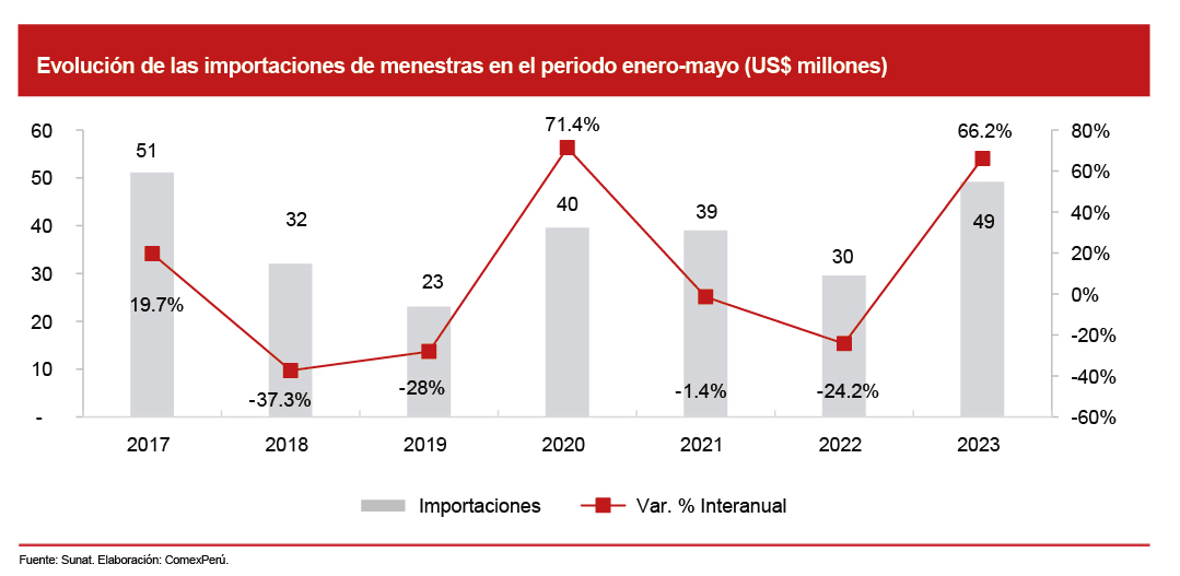 Por otro lado, las importaciones peruanas de menestras sumaron US$ 49.2 millones en los primeros cinco meses del año, lo que evidenció un crecimiento del 66.2% con respecto al mismo periodo de 2022. Este crecimiento se debió al aumento del volumen importado, que ascendió a 47,682 toneladas, un 81.7% más con respecto al año anterior.
