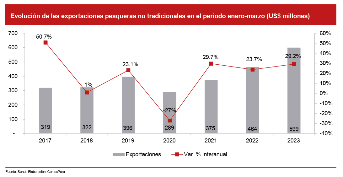 De acuerdo con las cifras de Sunat, en el primer trimestre del año, las exportaciones pesqueras no tradicionales registraron un valor de US$ 599 millones, lo que reflejó un incremento del 29.2% en comparación con el mismo periodo del año anterior. Al revisar los resultados mes a mes, se evidencia un dinamismo constante, puesto que en enero de 2023 alcanzaron un valor de US$ 139 millones, con un crecimiento del 10.5%; en febrero, US$ 209 millones, con un aumento del 28,4%; y en marzo, US$ 251 millones, con un incremento del 43.3%.